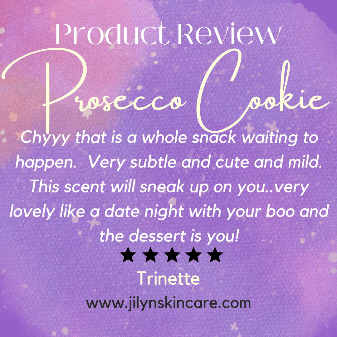 - Prosecco Cookie - notes of vanilla sugar cookie, musk, caramel, buttercream, raspberry prosecco, jasmine, and black currant